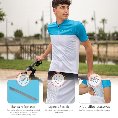 🚴 El maillot hombre ciclismo corto para hombres cuenta con tiras de gel para una correcta sujeción. 3 bolsillos traseros elásticos para teléfonos, llaves, dinero en efectivo, cartera, gafas de sol, linternas, barritas de proteínas y otros accesorios. Tiene una banda reflectante para su seguridad vial en bicicletas. Los mallot cortos ciclismo hombre estan pensados para tu comodidad.